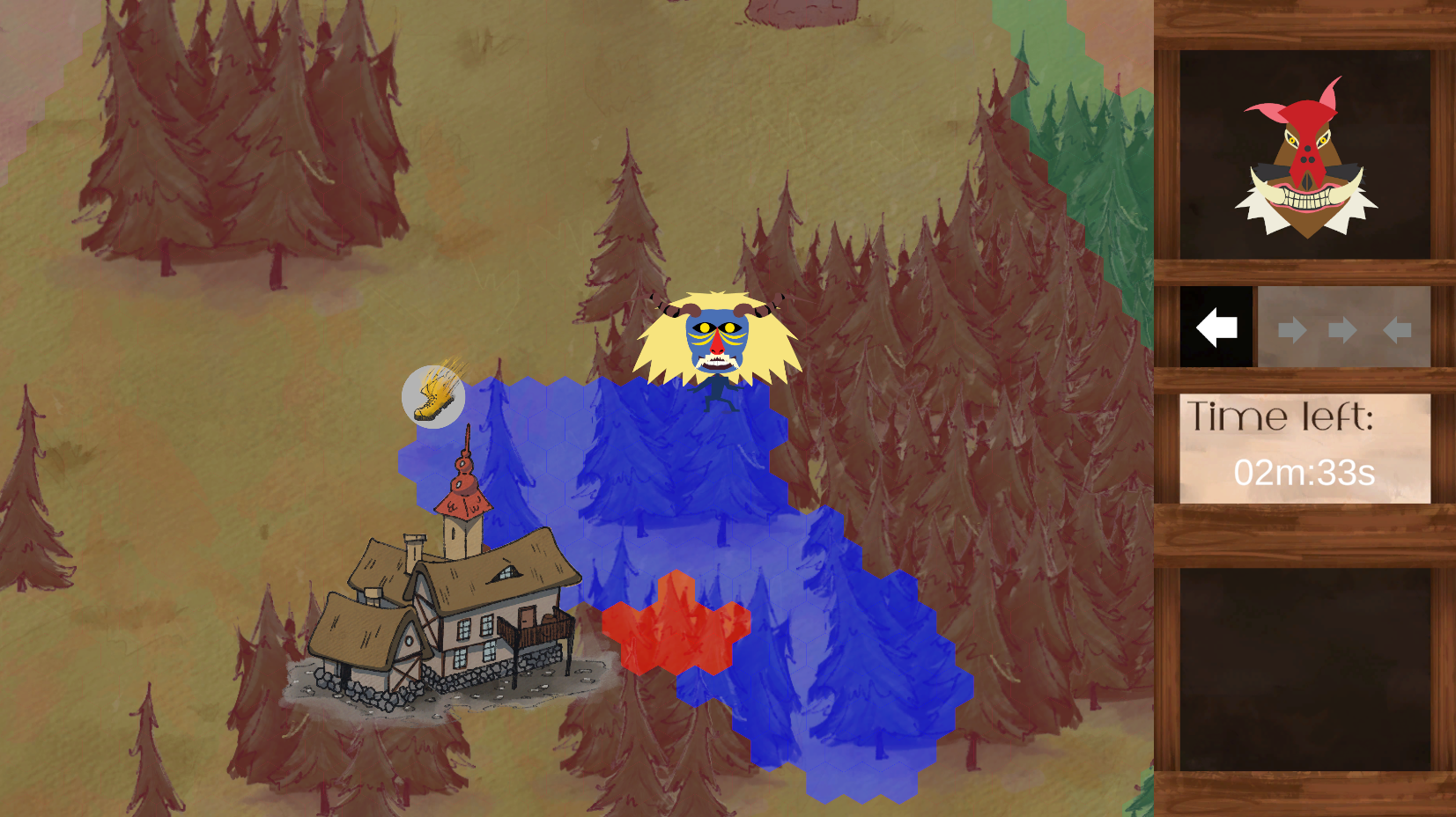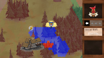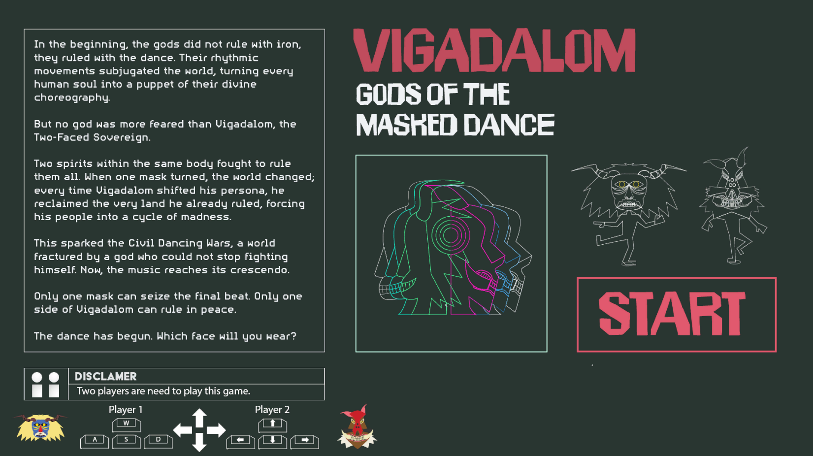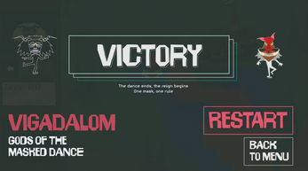 Only one player is able to control vigadalom at a time, as represented by the mask he is wearing. When in control, the player is able to claim the territory they dance across. If a player gains enough territory in a region the people become convert to that mask and the region becomes theirs till the end of the match, granting them either more dance speed or making it harder for the other player to claim control of the dancing god.